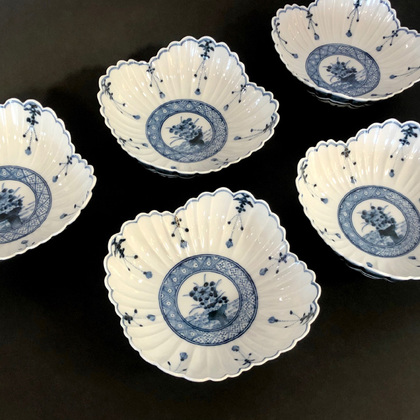 白地と染付の藍、そしてやわらかな緑を加えることで涼しげな印象を受けます。 縞模様は側面も途切れることなく描かれ、裏面を覆い、高台まで続きます。まさに縞模様を纏っているようです。 |